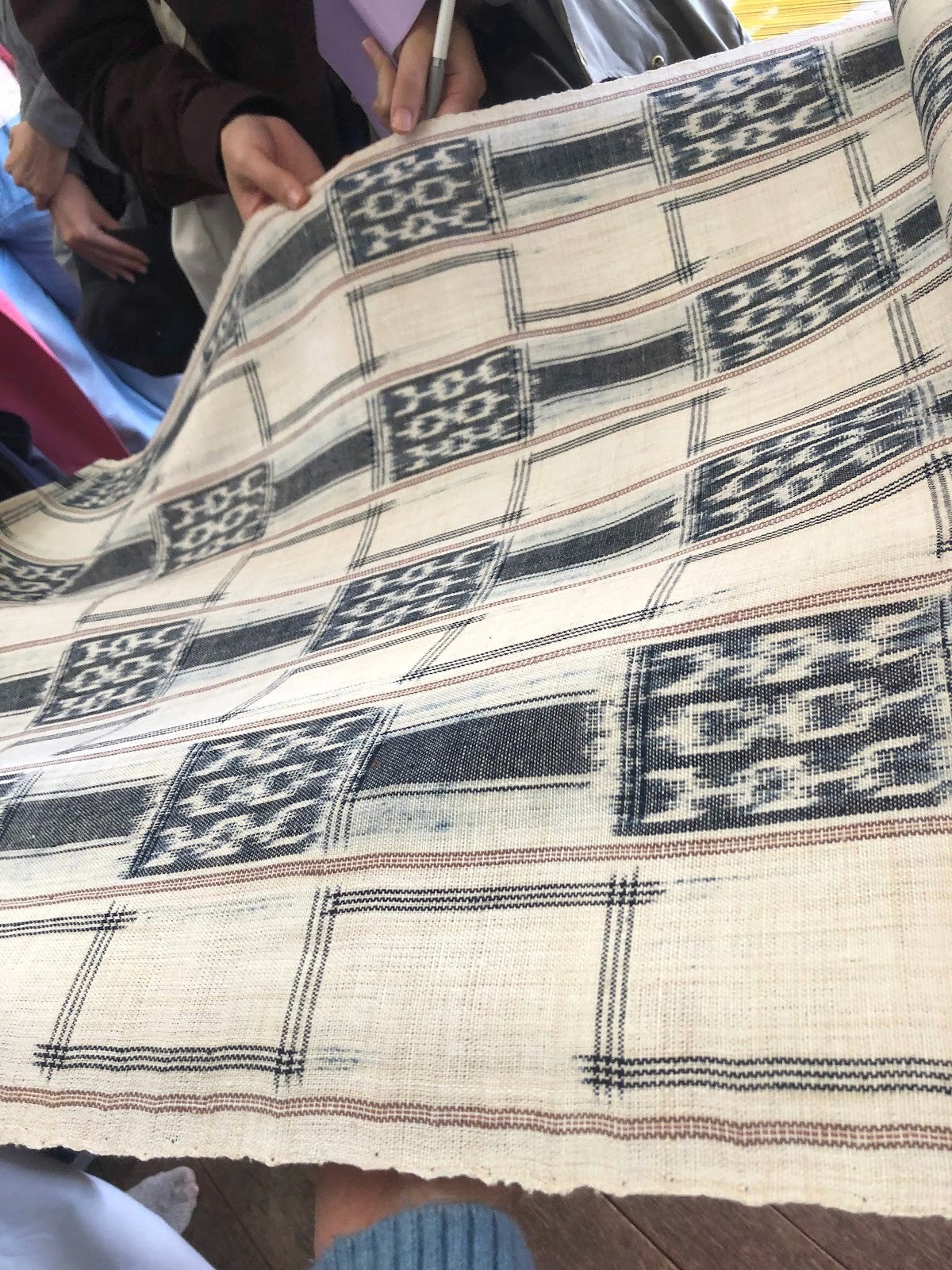 Det var to uker med mye læring og utrolig mye veving. På disse to ukene rakk vi å veve 3 ulike vev- en i ramie, en i silke, og en i lin. Det var med andre ord et intensivt kurs. Vi fikk lærte oss alt det grunnleggende ved kasurivevingen - å klargjøre renningen, binde kasuriknuter, farge, sette opp veven, og veve.