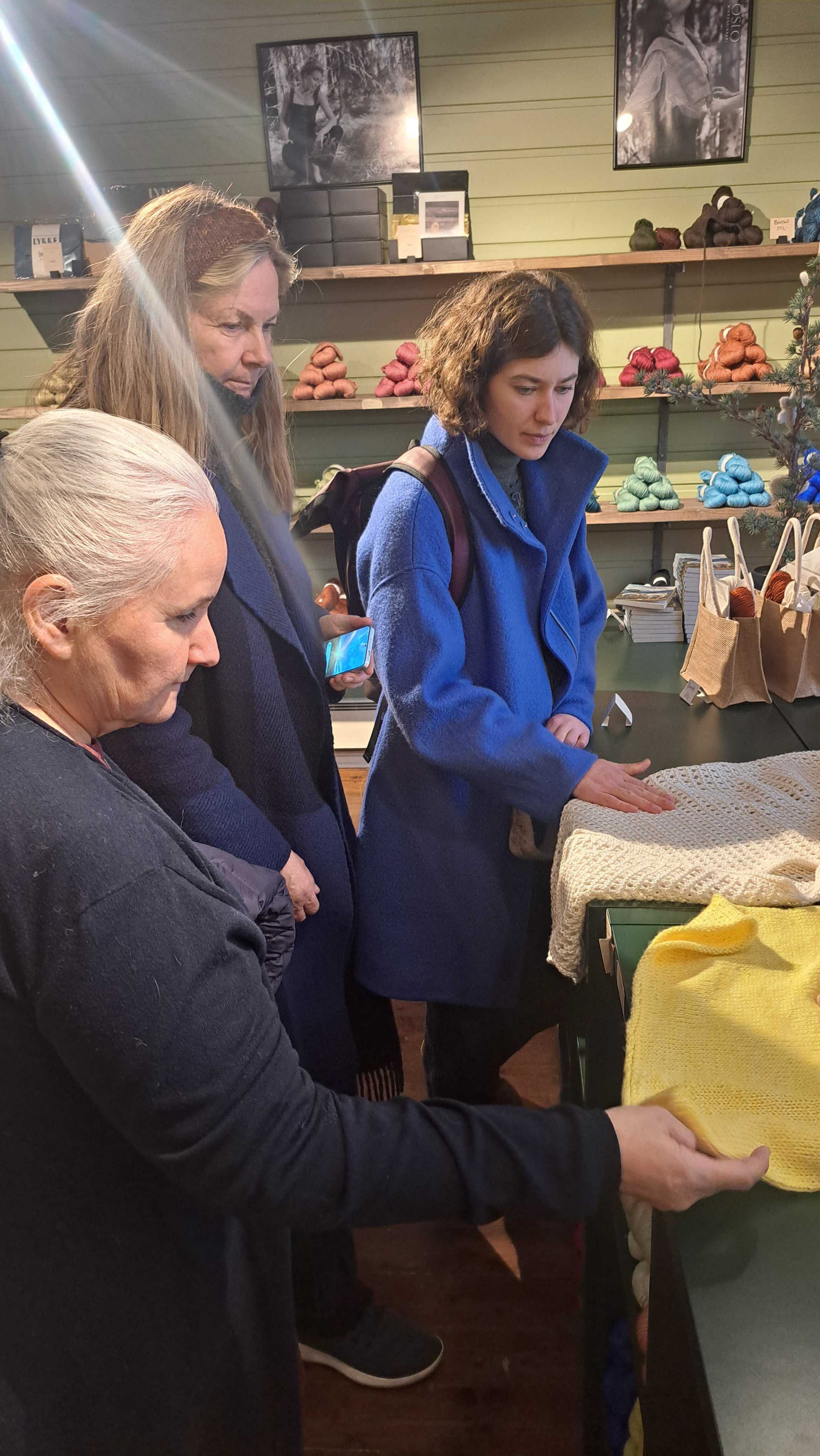 Vårt første stopp var innom butikken til Oslo Mikrospinneri beliggende på Røa. Her fikk vi sett, kjent på, og hørt om de ulike garnene som produseres hos Oslo mikrospinneri. Det er tydelig at Pernille som startet spinneriert brenner for den norske ullen, og de gode kvalitetene den besitter. Det var fantastisk å se hvor vakkert, spenstig, og mykt garn man får av å spinne den norske ullen på en skånsom måte!